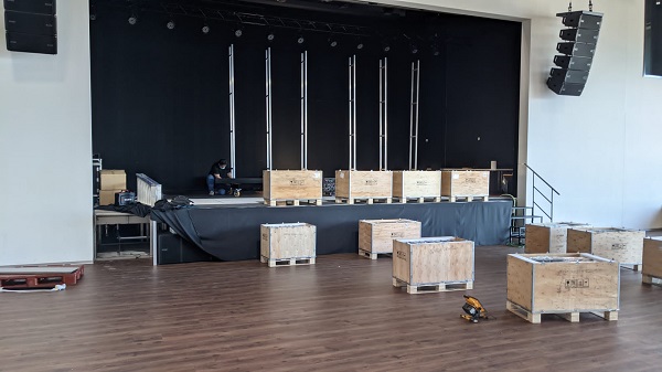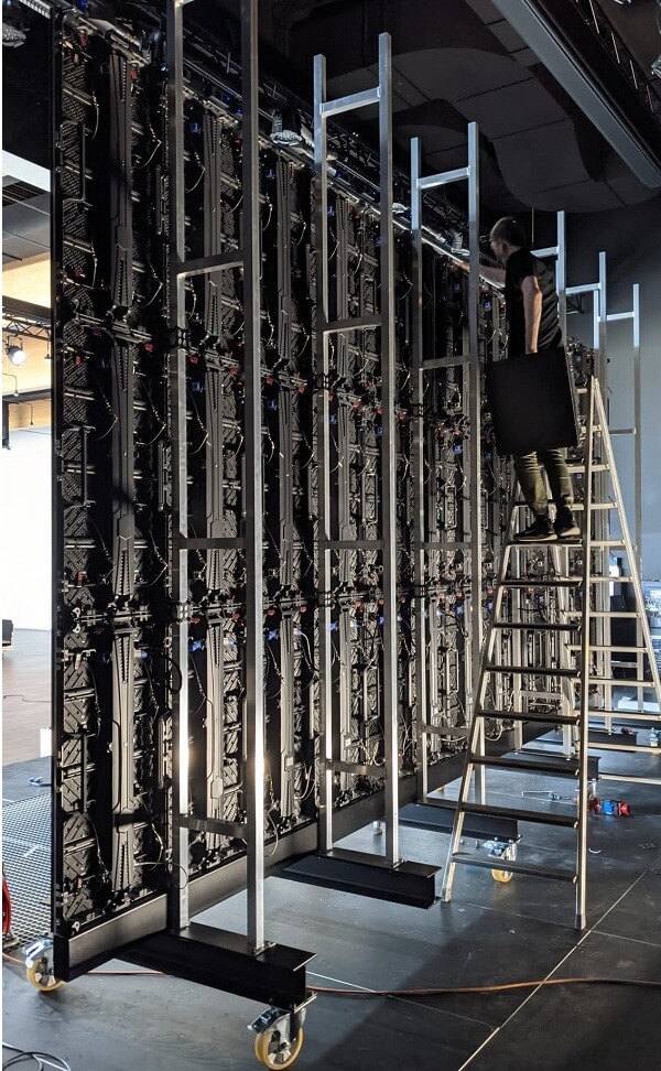 मूलतः ग्राहकाने स्टेजवर ट्रसवर टांगता येईल अशी स्क्रीन ठेवण्याची इच्छा केली होती, दुसऱ्यांदा विचार केल्यावर स्टेजच्या मजल्यावर स्टॅक होऊ शकेल अशी भिंत बांधण्याची शक्यता जास्त असते. आम्ही चाकांसह हलवता येईल असा कंस बांधण्याची शिफारस केली, स्क्रीन थेट मजल्यावर उभे राहण्याऐवजी कंसाच्या संरचनेवर स्टॅक करते. या सोल्यूशनचा फायदा असा आहे की नेतृत्व केलेली भिंत रंगमंचावरील कोणत्याही पोझिशनमध्ये वियोग न करता मुक्तपणे जाऊ शकते.